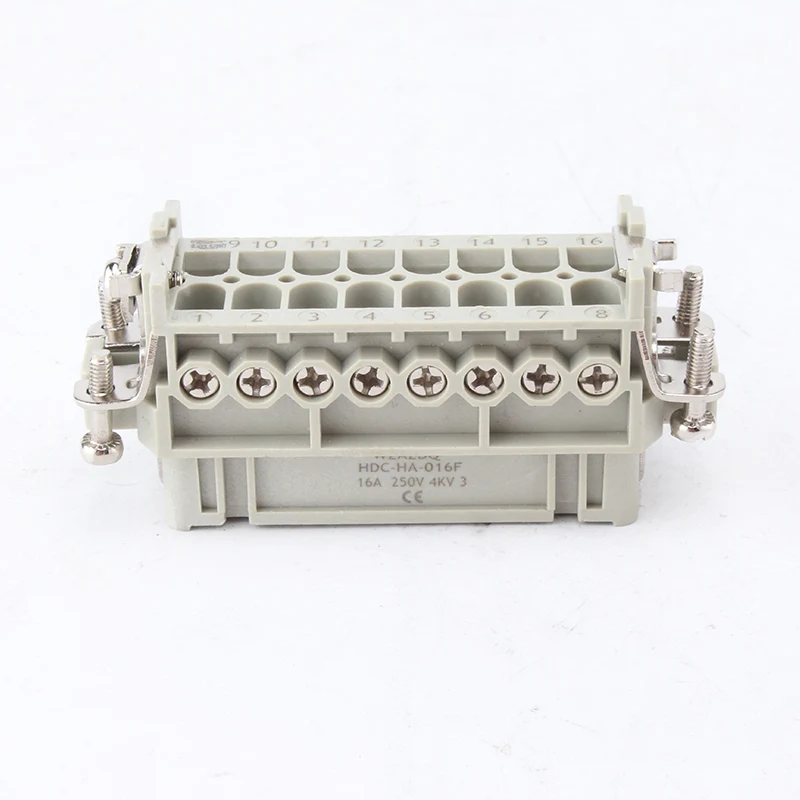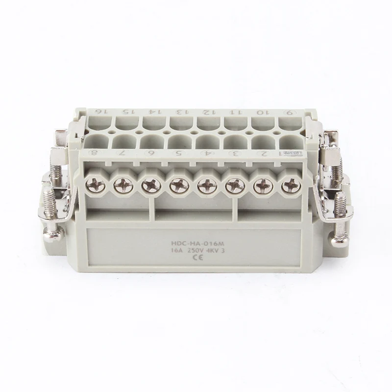 16A 10 Pin Txertatu Heavy Duty Konektoreak emeak eta gizonezkoak pieza geldoak dira. HA-016-M eta HA-016-F gizonezko eta emakumezkoen atalak dira, multzo gisa parekatzen dira. H16A aluminiozko karkasarekin batera ari dira lanean. Txertatutako osagaiek eta kanpoko karkasak elkarrekin konektore-produktu osoa osatzen dute. PC oskolez eta letoizko pinez eginda daude, zilarrez estaliak dituztenak. Zilarrezko pinek konexio elektrikoak ondo egiten dituzte.