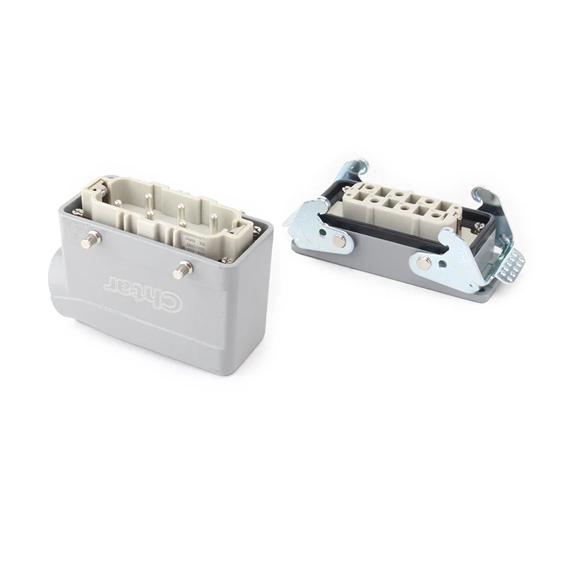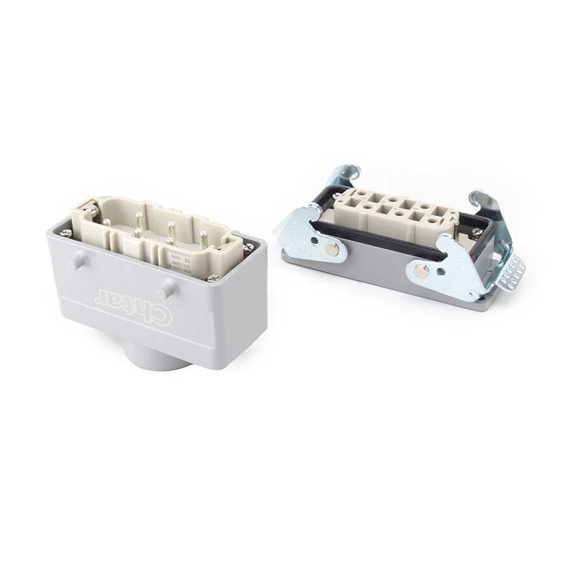 CHTAR kalitate handiko 35A 6 Pin Txertatze Heavy Duty Konektore honek 35A H16B-TG edo H16B-TS etxebizitze astuneko konektorearekin bat dator. Erresistentzia handiko PC materialarekin egina dago eta 6 pinekin muntatuta dago H16B aluminiozko karkasa batean. 12 pin ere izan daitezke, H32B-TG edo H32B-TS baino bi aldiz gehiago.
