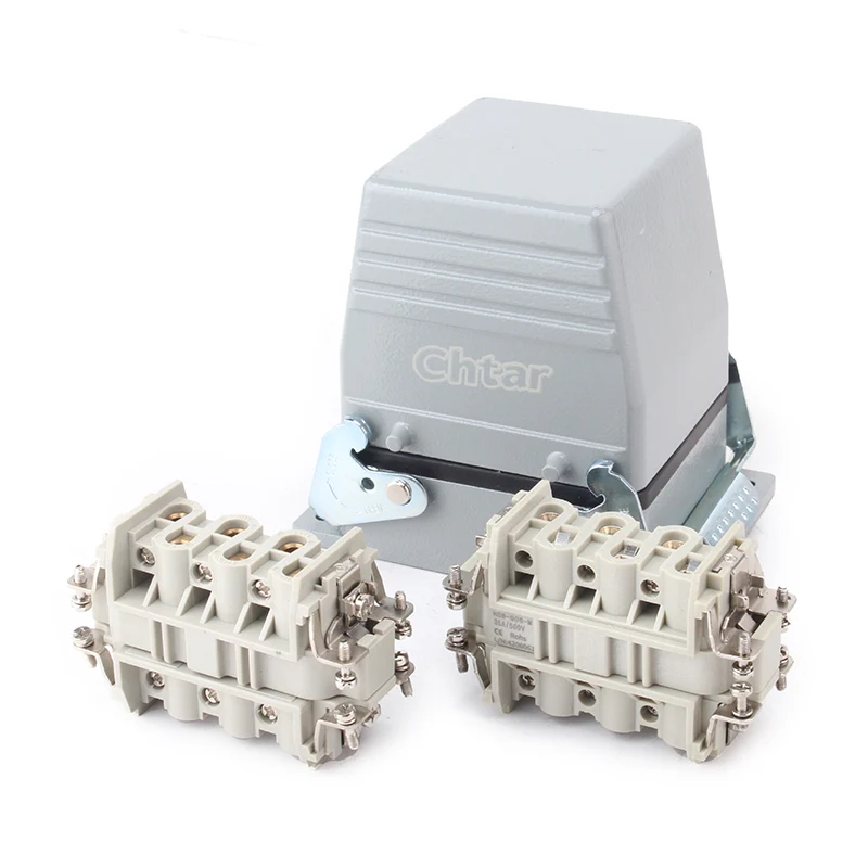 35A 6 Pin Txertatu Heavy Duty konektorea H16B aluminiozko konektore astuneko etxebizitza lantzen da. PC material sendoz egina dago eta letoizko zilarrezkoa da. CHTAR letoizko pinak zilarrez estalita daude, kalitate onekoa eta eroankortasun elektriko hobea. Zigilu-goma dauka iragazgaitza egiteko ezaugarri ona izan dadin.