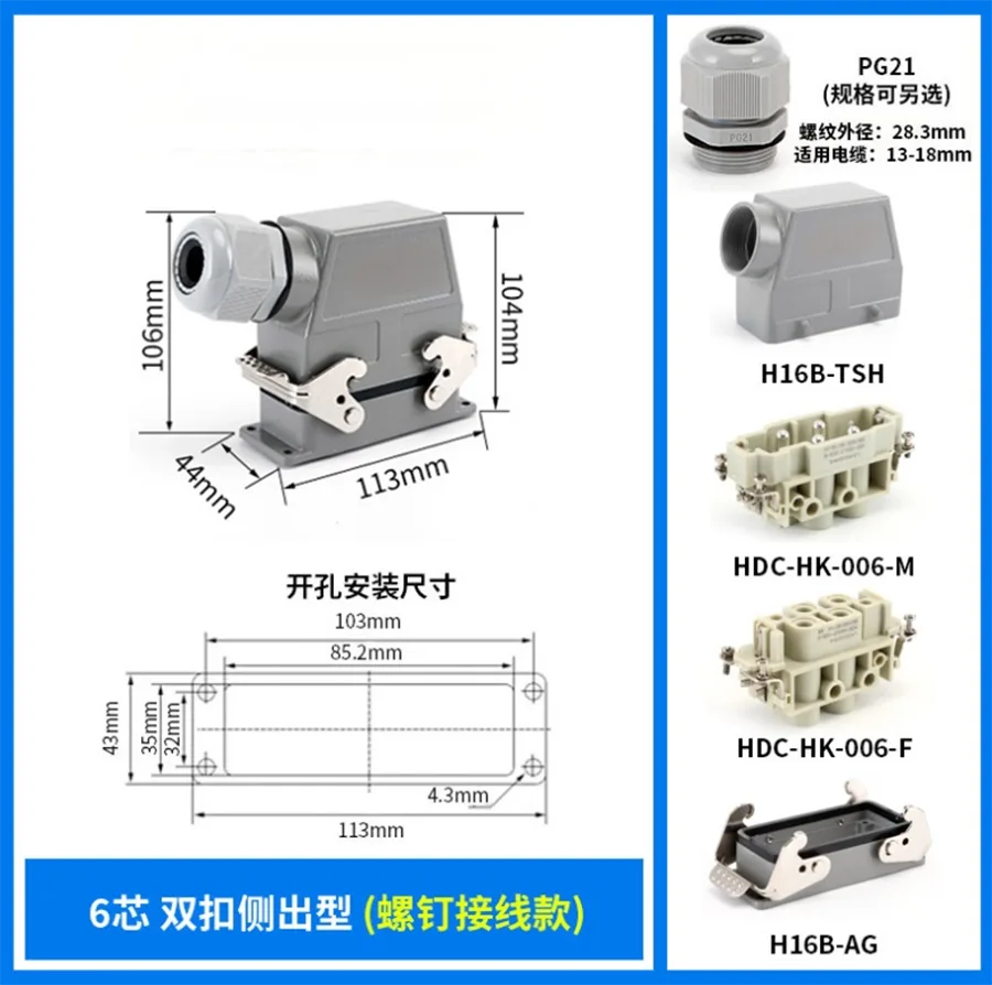 80A 4 + 2 Pin Txertatu Heavy Duty konektorea H16B-TSH aluminiozko konektore astuneko carcasa lantzen da. PC material sendoz egina dago eta letoizko zilarrezkoa da. CHTAR letoizko pinak zilarrez estalita daude, kalitate onekoa eta eroankortasun elektriko hobea. Zigilu-goma dauka iragazgaitza egiteko ezaugarri ona izan dadin.
