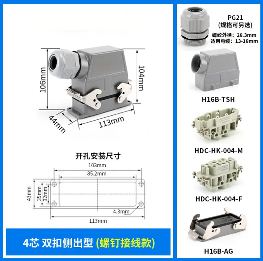 HK-004/0-M HK Heavy Duty konektoreak 80A korronte azpian ari dira lanean. Hariekin harremanetan jartzeko 4 pin ditu. Lan-baldintza desberdinetarako eskaintzen da, eta industria automatikoetan eta makinen kable-konexio motatan erabiltzen da.