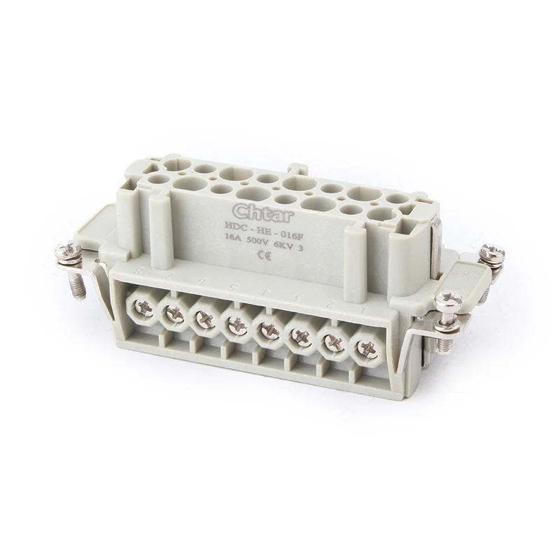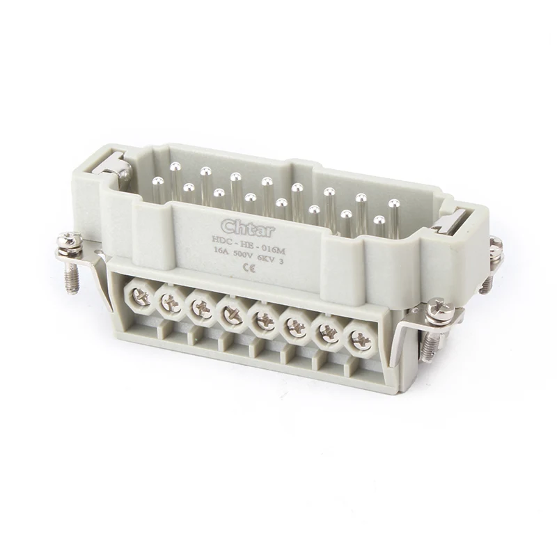 CHTAR-en 16A HE-016-F/M entxufe-konektore aurreratua M/F 16 pin-ko txertatze-konektore gogorra da. Gizonezko eta emakumezkoen atalak ditu. H16B shell pisu handiko konektorearekin bateragarria da. Normalean, gizonezkoen osagaia gizonezkoen etxebizitzan muntatzen da, edo emakumezko osagaian munta daiteke alderantzizko instalaziorako, bezeroen eskakizunen arabera. PCaren karkasaren material sendoak eta zilarrezko letoizko pinek M/F 16 pin entxufagarriko konektorearen eroankortasuna eta abantaila operatiboak bermatzen dituzte.