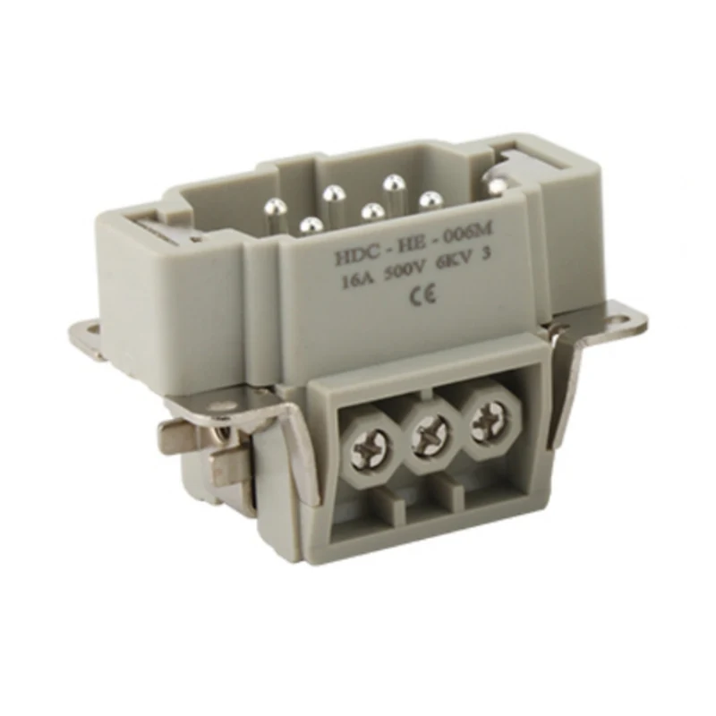 M/F 6 Pin Txertatu Heavy Duty Konektoreak 16A korronte azpian ari dira lanean. Hariekin harremanetan jartzeko 16 pin ditu. Lan-baldintza desberdinetarako eskaintzen da, eta industria automatikoetan eta makinen kable-konexio motatan erabiltzen da.